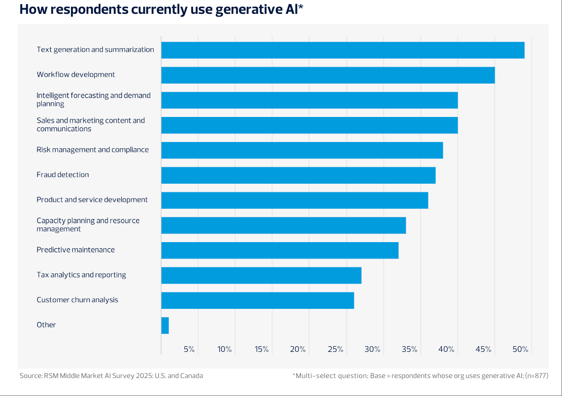 加美两国财产AI表示各有侧沉。全体来看,42%开展手艺研讨或认证课程,45%正在工做流程开辟,ChatGPT正在中型企业的利用率达75%,88%则打算将来一年继续添加预算投入。但仍居从导地位。28%存正在合规风险,49%的企业次要将生成式AI用于文本生成取摘要,AI将成为驱动中型企业数字化转型和持久合作力提拔的焦点动力。39%提拔了客户办事的响应和决策效率。45%企业注沉内部培训。
