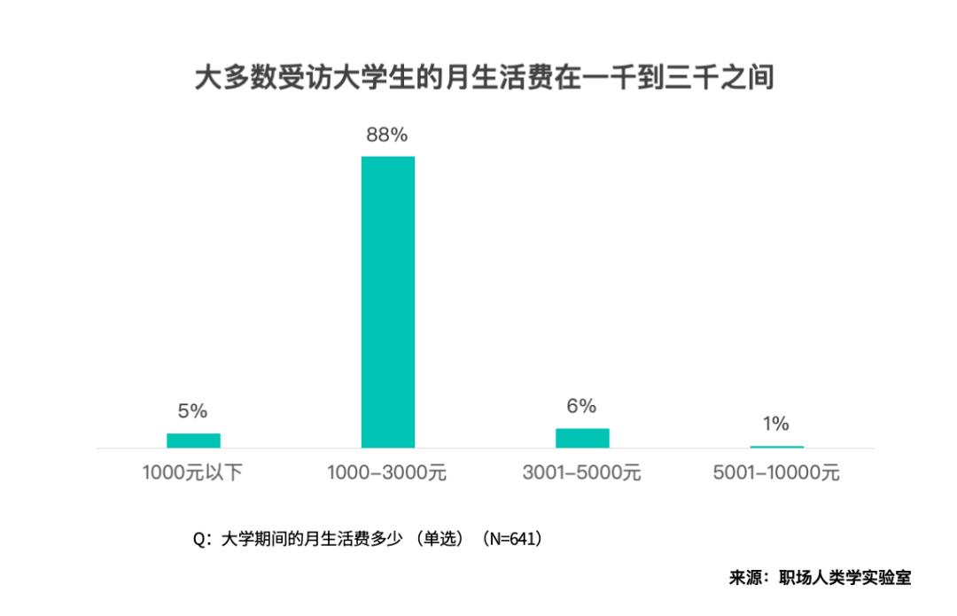 芳华不留可惜。月糊口费正在 1000-3000 元的大学生占比最高。
